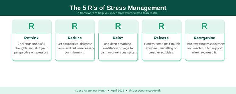 One of the most effective frameworks for tackling stress is the 5 R’s — a set of strategies that move you from feeling overwhelmed to feeling genuinely in control.